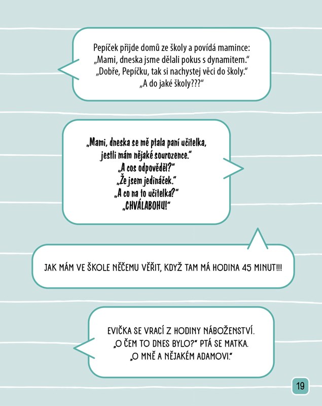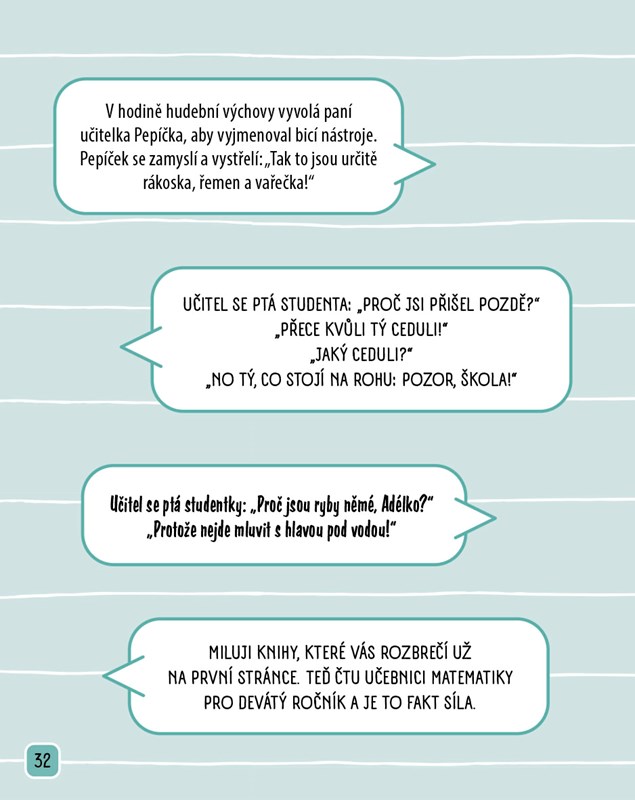 Škola může být pěkná fuška… ale taky velká legrace! Tahle knížka je nabitá hromadou vtipů o žácích všeho druhu – o těch, co všechno ví, i o těch, co neví nic – o učitelích, kteří mají nervy z oceli, nebo věčně na pochodu. Čekají tě školní trapasy, hlášky a veselé situace, které tě rozesmějí tak, že ti spadne aktovka.
