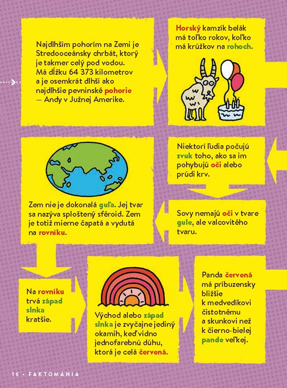 Vydajte sa po poučnej ceste plnej faktov. Akých faktov? Ohurujúco rozmanitých faktov! Natrafíte na fakty o pavúkoch, soli, dierach, bláznivých budovách, vajciach, divných zákonoch, smradľavých veciach, pukancoch... Znie to bláznivo? No, možno trošku. Ale fakty predsa nemusia byť iba vážne. Hlavne, že sú pravdivé (fakty vo Faktopii sú overené vydavateľstvom Britannica). V knihe však nájdete aj menej bláznivé zaujímavosti o vode, hmyze, vesmíre, mapách, hudbe atď.