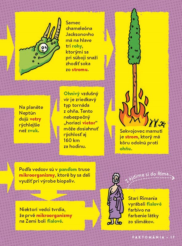 „Na každý fakt ihneď nadväzuje ďalší a súvislosť medzi nimi je vždy maximálne vydarená a prekvapujúca.“ Od zelenej krvi druhu jašterice žijúcej v Papue-Novej Guinei vedie trasa k faktu o príčine ružového sfarbenia plameniakov, pokračuje k pomenovaniu človeka či zvieraťa majúceho každé oko inej farby, prechádza k výnimočným chobotniciam a na konci dvojstrany venovanej farbe stojí Dúhová hora v Peru.