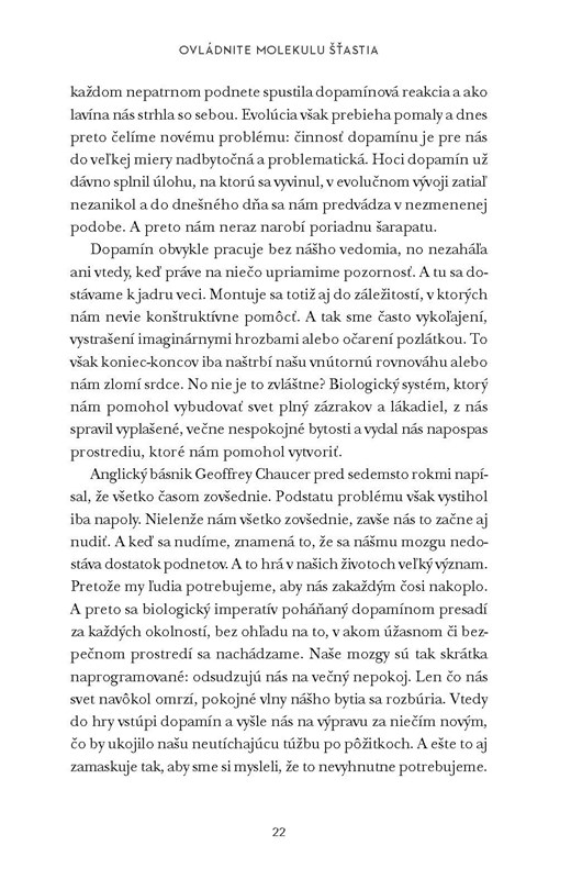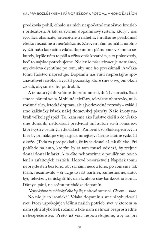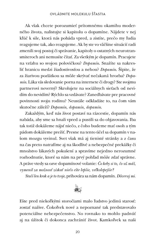 Dopamín, „molekula šťastia“, je príčinou toho, ako ľahko dokážeme uviaznuť v neustálom cykle hľadania ozajstnej spokojnosti. Hoci nám sľubuje šťastie, nedokáže nám ho zaručiť. To záleží len na nás. Plnohodnotnejší život sa začína trénovaním mozgu na to, aby prekonal honbu za touto látkou. A je to jednoduchšie, ako si myslíte.