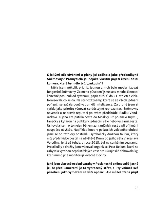 Jak vidí fungování české domácí i zahraniční politiky úspěšná politička, dlouholetá poslankyně a předsedkyně TOP 09 Markéta Pekarová Adamová? Jak obtížné pro ni bylo obstát v převážně mužském, vysoce konkurenčním světě? A jak dnes hodnotí některé politické kauzy a nečekané zvraty vlastní kariéry? V nezvykle otevřeném rozhovoru s novinářkou Terezou Šídlovou se předsedkyně Poslanecké sněmovny nevyhýbá osobním otázkám ani ožehavým tématům.