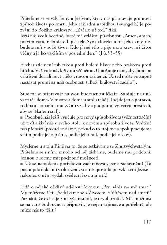 Omezování a potlačování svobodného života za minulého režimu zasáhlo nemalou měrou i život křesťanských církví. Proto se i památka Večeře Páně musela často slavit tajně a ve stísněných podmínkách. Paradoxně tím víc ale vynikala hloubka tohoto nejvzácnějšího Ježíšova odkazu. Přiblížení tajemství poslední Večeře Páně měla přispět i liturgická reforma Druhého vatikánského koncilu. Jejím smyslem bylo navázat na odkaz prvotní církve a na přirozený a oprávněný vývoj v její tisícileté tradici. To dnes znamená naučit se žít v duchu obnovené liturgie, krok za krokem ji uvádět v život a chápat ji jako stále živé znamení spásy v jednotlivých křesťanských společenstvích. Doplněné vydání oblíbené knihy, v níž autor shromáždil své bohaté pastorační zkušenosti, se vyjadřuje i k aktuálním událostem.