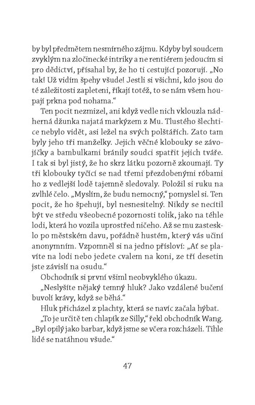 Na nejnebezpečnější plavbu svého života se soudce pustil v zimě roku 664 ve svých třiceti čtyřech. V době, kdy spravoval malé město na severovýchodním pobřeží Číny, nedaleko ústí Žluté řeky, byl soudce Ti povolán do hlavního města Tchangů, aby vypovídal o svém posledním případu. Sotva se vydá na plavbu po Žluté řece, dostává nový služební příkaz: zajistit bezpečnost svědka netrpělivě očekávaného v Zakázaném městě. Je tu ale háček, soudce Ti vůbec neví, kdo z cestujících je ten Laj, kterého má chránit. Zatímco mu před očima ubíhá překrásná krajina severní Číny, množí se kolem mandarína vraždy a pokusy o zabití.
