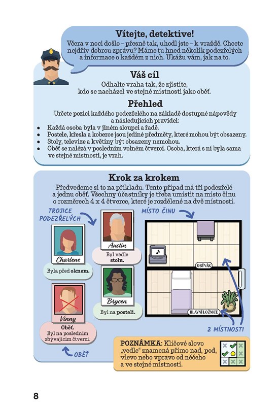 Vstupte do světa logických záhad, kde každá stránka ukrývá stopy a žádný detail není náhodný. Ocitnete se v kasinu, na šachovém turnaji, v opeře, knihkupectví i na středověkém hradě. Budete řešit hádanky v kavárně, lyžařské chatě či v podzemním úkrytu při zombie apokalypse. Začněte u jednoduchých úkolů a postupujte až k těm nejtěžším, které potrápí i skutečné mistry dedukce. Dokážete projít celou cestu a stát se mistrovským detektivem?
