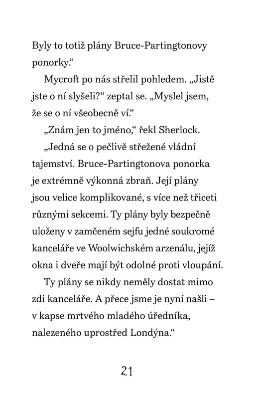 Superzbraň v rukou zločinců by mohla změnit svět a vypadá to, že Sherlock Holmes je jediný, kdo tomu může zabránit. Kdosi totiž ukradl tajné plány na Bruce-Partingtonovu ponorku. Vláda, armáda i jeho bratr Mycroft doufají, že přijde na to, kdo to byl. Dokáže geniální detektiv rozplést pavučinu záhad a odhalit mazané zloděje dříve, než se stane něco strašného?