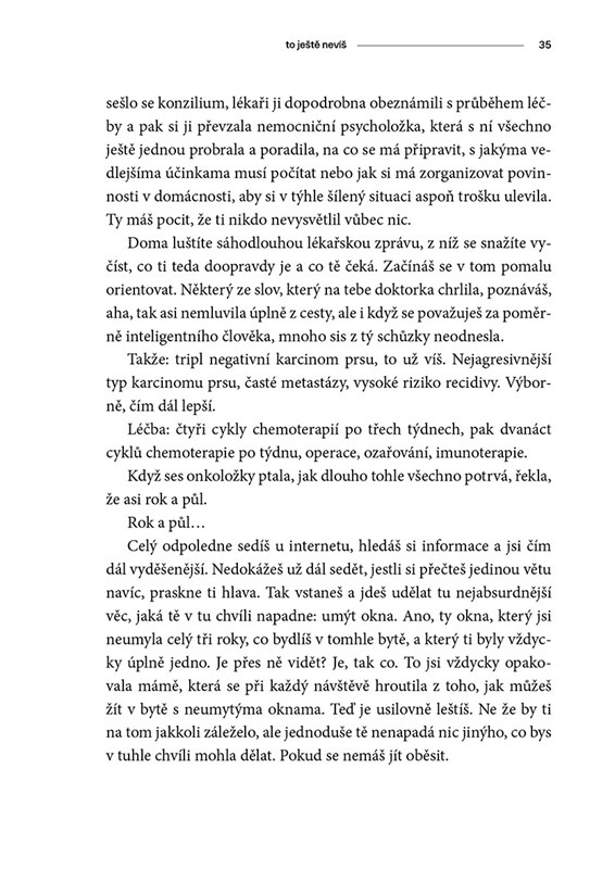 To ještě nevíš je syrová autofikční próza o životě s obávanou diagnózou a snaze neztratit ani v nejtěžších chvílích sám sebe.