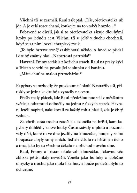 Tři kapybary – Raula, Emmy a Tristana – už omrzelo trávit čas jen na louce v zoo. A protože to jsou nerozluční parťáci, kteří mají hlavu plnou nápadů, vymyslí plán, jak se dostat za plot. Co je v neznámém světě čeká? Je pravda, co se povídá o krvelačných vlcích, zákeřných morčatech a poťouchlých opicích? Tohle se musí nutně prozkoumat!