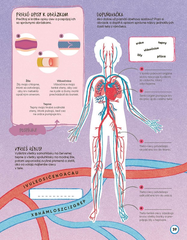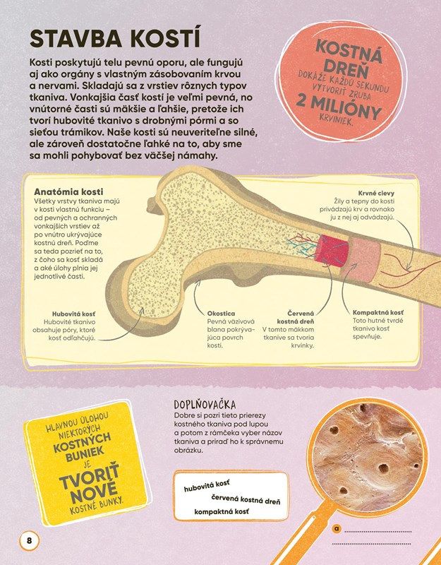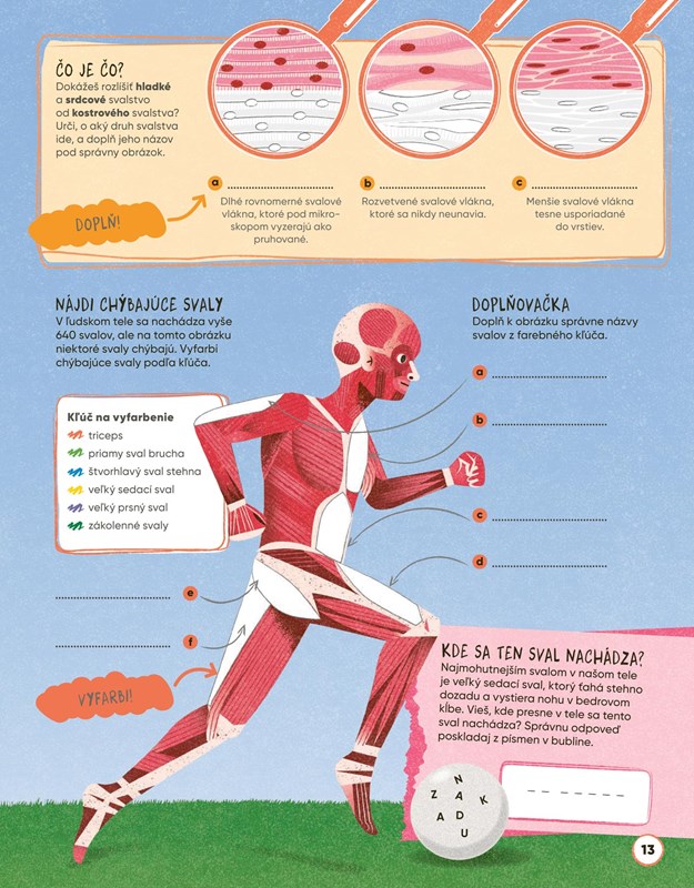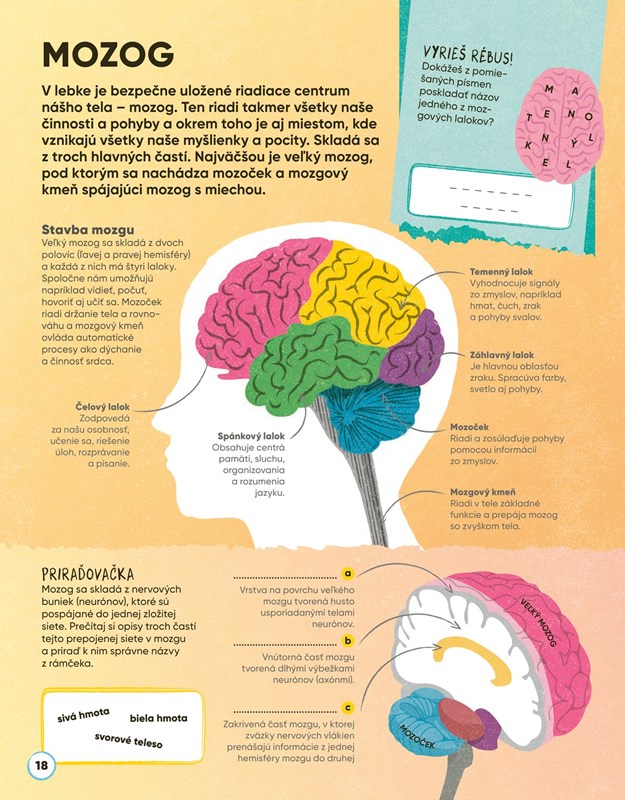Už žiadne nudné otázky a nezáživné testy, čakajú ťa skvelé názorné obrázky s jednoduchými popismi, po ktorých nasledujú zaujímavé úlohy od vyfarbovania častí mozgu až po odhaľovanie tajomstiev ľudských kostí.
