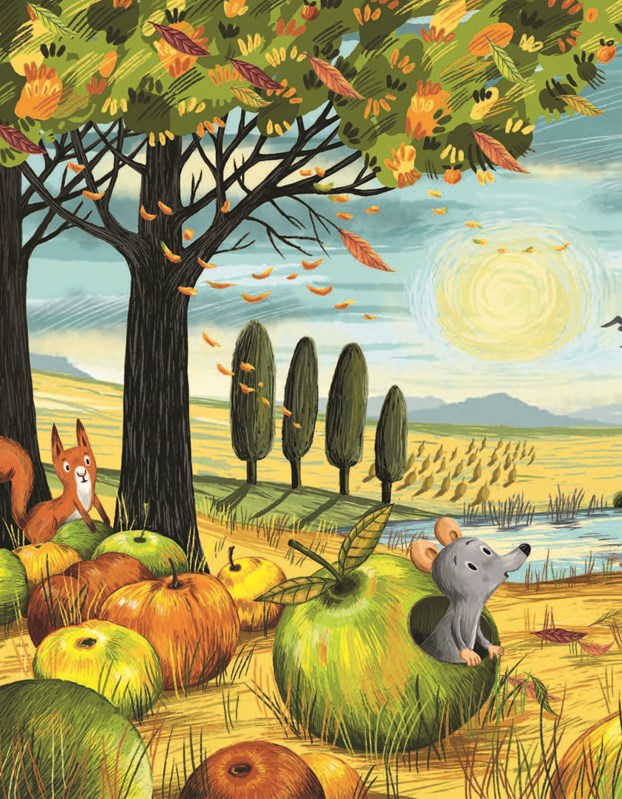 Podzim je tady a les se mění v nádherné moře barev. Liška, myš a havran posmutněli, protože dobře vědí, že teplé dny, kdy jim slunce hřeje kožíšek a peří a kdy se potrava hledá snadno, jsou sečteny. Veverku to však vůbec netrápí. Vesele si hledí svého a ani divoká podzimní bouře, která se jednoho dne strhne nad lesem, ji vůbec nerozhází. Nebo snad ano?