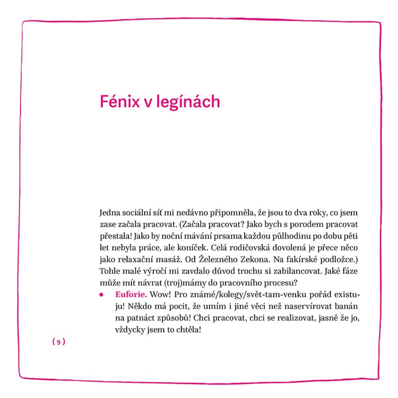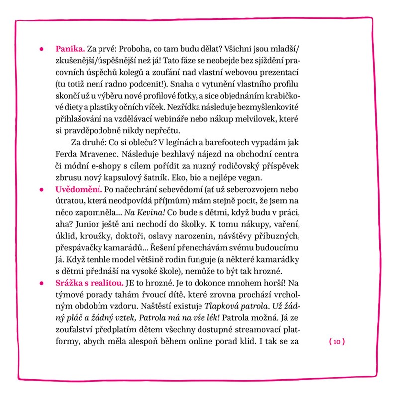 Než se jí narodily děti, netušila, kolik zdánlivě jednoduchých věcí lze s dobrým úmyslem udělat blbě. Spánková deprivace přímo úměrná péči o pětičlennou domácnost vyústila v nezdravý vztah s italským kávovarem a tuto knihu. Ta je posttraumatickou terapií náročné reality rodičovství a dávkou intenzivního humoru pro rodiče současné i budoucí. Sebeironie a nadhled by se totiž měly v porodnici fasovat společně s krémem na opruzeniny…