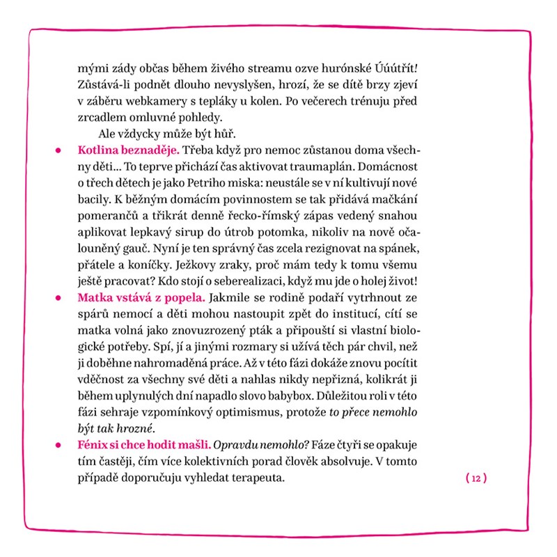 Dvaadvacet fejetonů popisujících s ironií a nadsázkou situace rodičovské každodennosti, v nichž realita často přejede iluze jako parní válec.