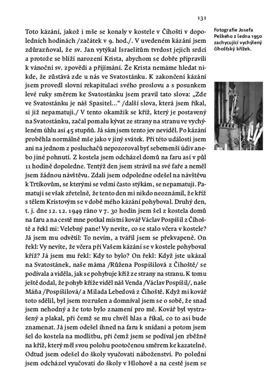 Advent 1949, zasněžená mrazivá Vysočina, nedělní dopoledne 11. prosince. V malém kostele v Číhošti se při kázání sedmačtyřicetiletého P. Josefa Toufara třikrát zakýval dřevěný oltářní křížek a zůstal zkroucen a vychýlen mimo těžiště. Pohyb křížku vidělo dvacet svědků. Následně se do rozbíhajícího církevního objasňování vlomila komunistická Státní bezpečnost. P. Toufar byl zatčen, unesen a mučením jej příslušníci StB nutili lživě doznat, že vše podvodně sestrojil. Toufarova mučednická smrt zhatila připravovaný inscenovaný monstrproces, nezastavila však otevřený útok komunistického aparátu proti katolické církvi. Autor této knihy se zdaleka nespokojil s tím, že by začal vypravovat životní příběh kněze Josefa Toufara (1902 až 1950) dnem jeho příjezdu do Číhoště. Dosud stál hlavní aktér příběhu stranou, nikde nebylo možné dočíst se, z jakých pocházel poměrů, co jej vedlo k rozhodnutí stát se knězem a jak dlouhá cesta vedla k vysvěcení. Základní pohnutkou k sepsání díla nebylo vyvrácení či potvrzení toho, zda se křížek skutečně v adventním čase roku 1949 tajemně zahýbal, ale naléhavá touha pochopit, kdo Josef Toufar byl a co všechno v jeho údělu předcházelo dějství poslednímu. Léta pátrání, shromažďování dokumentů, snímků i svědeckých výpovědí tvoří opěrný systém díla. Miloš Doležal nepojímá obsáhlý životopisný portrét patera Toufara jako chladné historické pojednání, nechybí v něm bezprostřednost ani humor, a přece ani o krok neustoupí požadavku na absolutní dokumentární věrnost, každou uvedenou informaci opírá o konkrétní nálezy v archivech a osobní svědectví pamětníků. Kniha Jako bychom dnes zemřít měli se skládá ze dvou rovnocenných částí, textové a obrazové. Vzniklý celek je také důkladně vyvedenou kronikou života jedné části Vysočiny v první polovině minulého století, krajiny, jež v sobě nese stigmata hrdinů a mučedníků. Spolu s autorem, pamětníky i fotografiemi putujeme po místech dnes zbořených, zatopených, či zjizvených necitelnými zásahy do krajinného profilu z dob komunismu. Ne náhodou říká básník a historik Zbyněk Hejda, že Miloš Doležal Vysočině vrací její paměť.