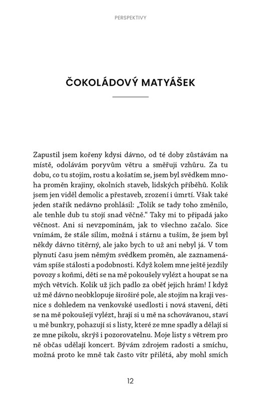 Nenápadně propojené povídky o odhodlání, touze někam patřit, předsudcích i zklamání vyprávěné větrem, suchým listem, prastarým stromem či jistou přízemní vypravěčku, jejíž identitu musíte teprve odhalit.