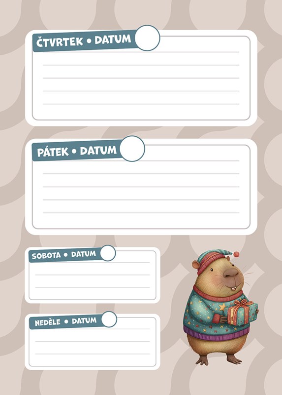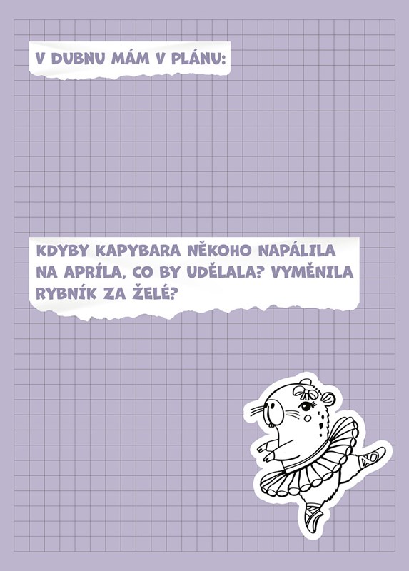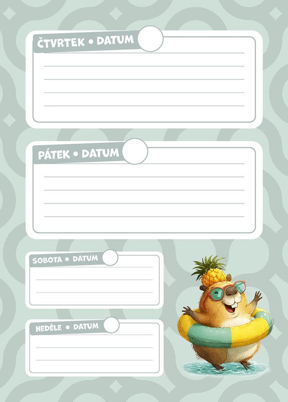 Připrav se na školní dobrodružství ve společnosti těch nejklidnějších zvířecích kámošů – kapybar! S tímhle zápisníkem si konečně udržíš přehled o všem, co tě ve škole čeká: úkoly, testy, výlety, kroužky… i volné dny na pohodové chillování s kamarády. Veselý, přehledný a kamarádský pomocník, se kterým zvládneš školní rok s úsměvem. Protože když ti hlídá záda kapybara, nic tě nerozhází.