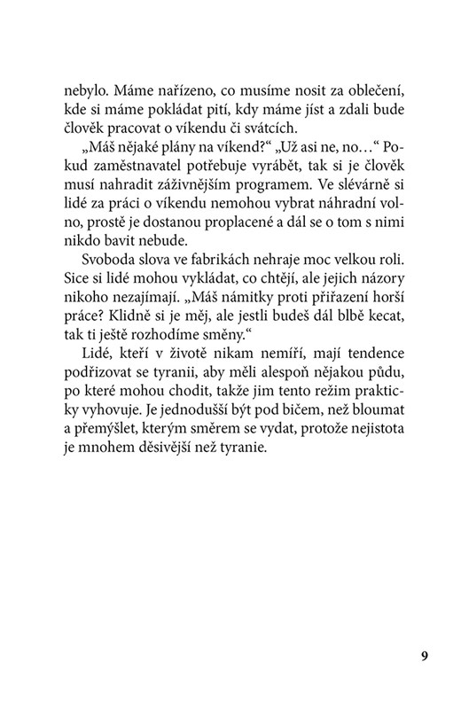 „Fabrika“ je nekompromisní, místy drsný a jindy groteskně vtipný pohled do života lidí ukrytých za zdmi výrobních hal. Seznamte se s postavami, které byste si sami nikdy nevybrali jako své kolegy – s Dědkem, jenž dokázal obelstít systém i šéfa a prozradí, jak na správnou masáž prostaty, s panem Romadurem, k němuž se nelze přiblížit na deset kroků, nebo s operátorem, který se dorozumívá výhradně mňoukáním. Každodenní dřina, pach potu, zvláštní rituály i nečekané jiskry lidskosti vytvářejí mozaiku, která čtenáře vtáhne a nepustí. „Fabrika“ vám ukáže, že i tam, kde vládne špína a olej, se odehrávají ty nejpodivnější i nejlidštější příběhy.