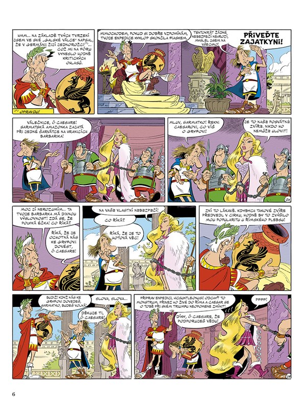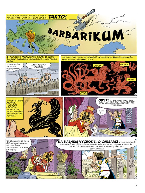 Na stejnou výpravu se ovšem vydávají i Římané pod vedení slavného geografa Hicsuntleona. Kdo najde gryfa dříve? To se dozvíte, až si přečtete nejnovější album Asterixe.
