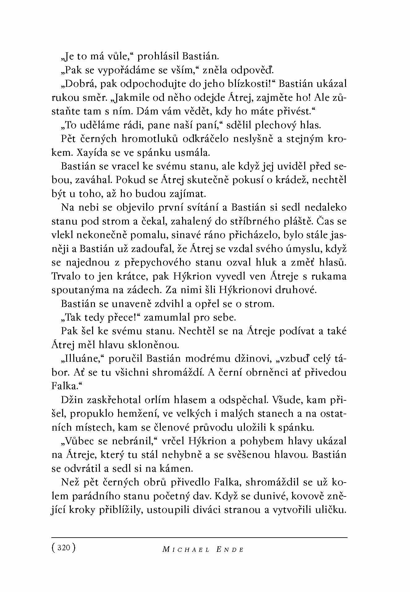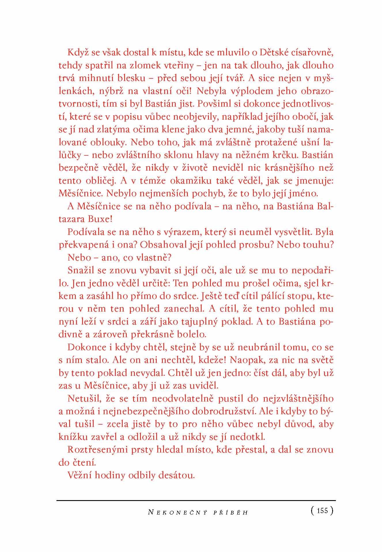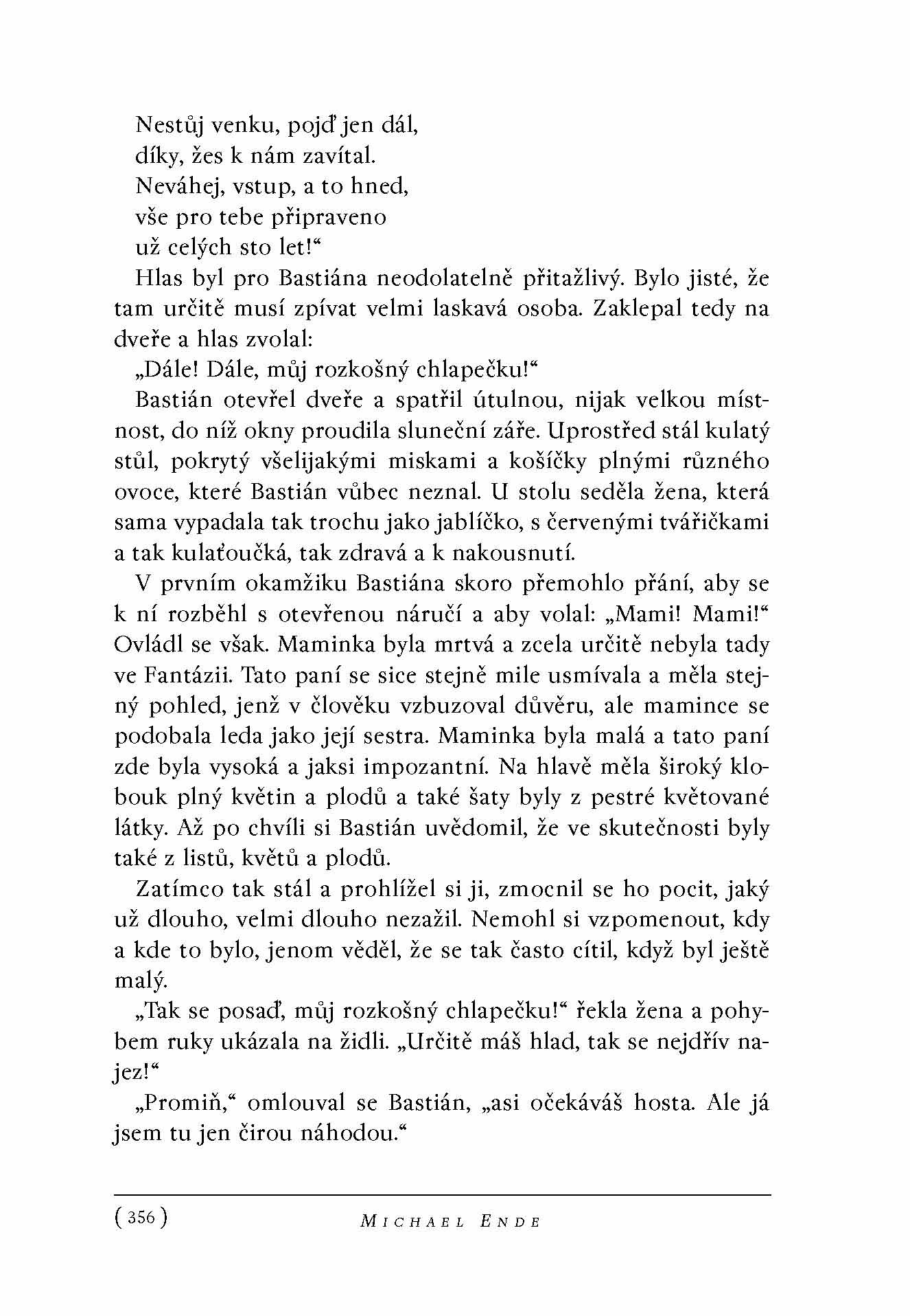 Příběh o tlouštíkovi Bastiánovi, nesmělém a všemi spolužáky vysmívaném chlapci, synovi nikoho, zavede čtenáře do zvláštního světa. Je jím Fantázie a Bastián se do ní dostane skrze stránky neméně zvláštní knížky. Spolu s chlapcem Átrejem – synem všech – prožije na Veliké Cestě Hledání četná dobrodružství. Nejednou se ocitne v nebezpečí, stane se z něj hrdina a zmoudří. Nakonec se vrátí tam, kde je jeho místo – mezi lidi.
