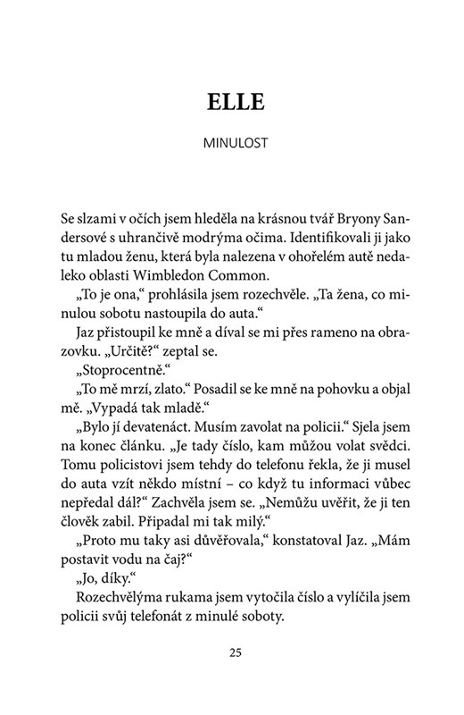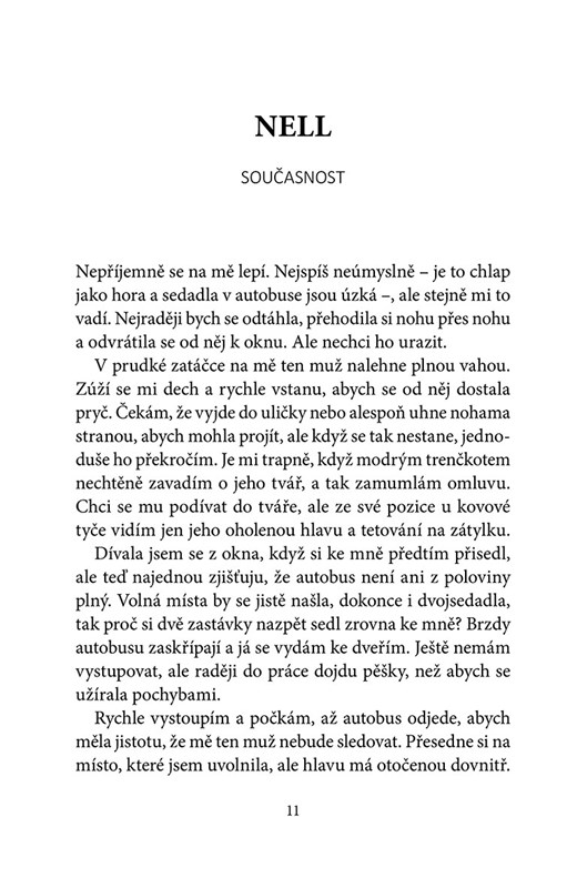 Co když se ze stalkera stane sledovaný objekt? B.A. Paris napsala další napínavý thriller s nečekaným dějovým zvratem. Nell je přesvědčena o tom, že ji někdo sleduje. Někdo, kdo je jí neustále v patách a dokonce se pohybuje v její domě. Někdo, kdo zná její temné tajemství. O čtrnáct let dříve se ještě jako Elle zapletla do vyšetřování vraždy a její posedlost dopadením vraha měla za následek sérii lidských tragédií. Nyní se pod identitou Nell snaží utéct před nepříjemnou minulostí, ale současnost je mnohem děsivější. V okolí jejího přítele Alexe totiž došlo k velmi znepokojivým událostem. Nell nebude mít klid, dokud se stalkerovi nepodívá do tváře. I s rizikem, že ji ten pohled může stát život.