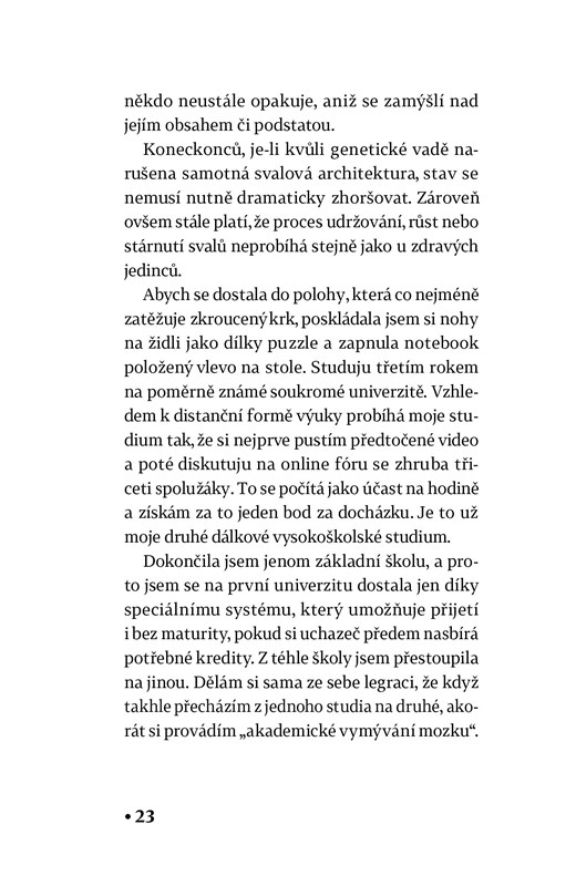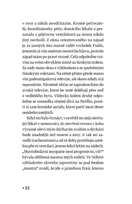 Napadlo vás někdy, jaké máte štěstí, že v ruce udržíte tištěnou knihu? Šákja si o něčem takovém může nechat jen zdát. Žije v chráněném bydlení uvězněná ve vlastním těle, závislá na pomoci pečovatelů i na přesném plánování každého pohybu. Kvůli vrozené nemoci jí postupně ochabují všechny svaly. Své frustrace i touhy si ventiluje na sociálních sítích. Když napíše, že by si přála otěhotnět, aby mohla jít na potrat jako normální žena, spustí sérii dramatických událostí, které otřesou jejím životem.