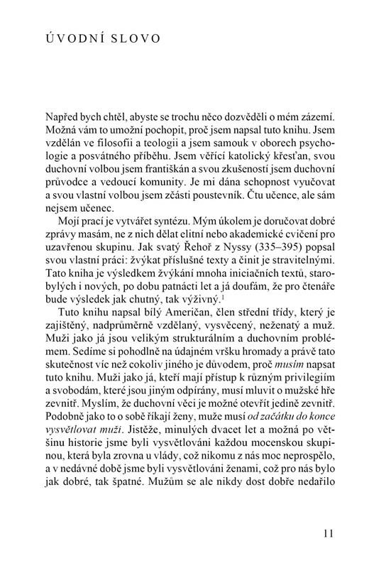 Richard Rohr strávil několik desítek let studiem iniciačních praktik, s jejichž pomocí se snaží rozvíjet a prohlubovat mužskou spiritualitu v rámci duchovních cvičení po celém světě. Jeho nová kniha Adamův návrat povzbuzuje k novému zamyšlení nad podstatou mužství a zároveň ukazuje možnosti iniciace v současných podmínkách. Obsahuje rovněž vzorový rituál iniciace spolu s množstvím doplňující literatury.