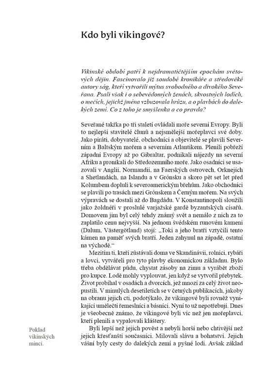 Claudia Bancková kriticky a přehledně zprostředkovává fundovaný pohled do života vikingů, kteří byli mimořádně úspěšní nejen na loupežných a dobyvačných výpravách, při nichž pronikali až na jihozápadní pobřeží Evropy, ale i jako protřelí kupci, zruční řemeslníci a smělí objevitelé. Jako první Evropané vstoupili na severoamerickou půdu, osídlili Island a Grónsko a zanechali runové nápisy zpravující o dobrodružných výpravách směřujících po Dněpru a Volze ke Kaspickému a Černému moři, a dokonce až do Bagdádu.