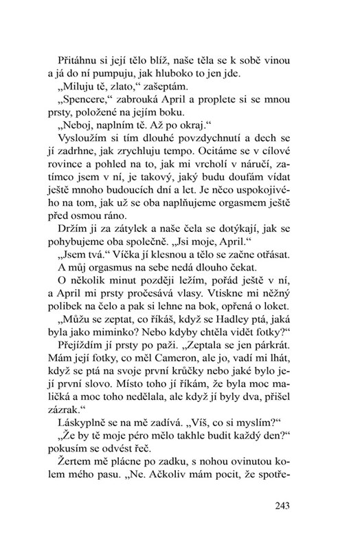 Než se naděju, zírají na mě dvě mrňavá očka. Ano, zjišťuju, že Spencer je sexy svobodný táta roztomilé holčičky. A to není jediný dějový zvrat, protože městečko u jezera jako by nás sbližovalo – všechny. Spencerovy a moje hádky vyšumí a naše pohledy jsou čím dál delší. Působí to, jako bychom se ztratili ve vlastním malém světě. A nakonec už si nejsem jistá, jestli je to Spencer nebo já, kdo se nás snaží přesvědčit, že by to možná stálo za pokus…