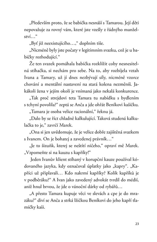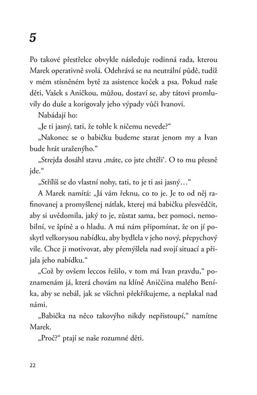 Vypravěčka Alena, bývalá manželka jednoho z bratrů, líčí na základě rodinných událostí svět, jaký kolem sebe dnes vidíme, svět, ve kterém se rodiče chovají jako nedospělé děti a jejich děti se snaží zastávat role dospělých. Podaří se Aleně zabránit v rámci rodiny otevřené válce? Nevysloví se věci, jež nelze vzít zpět? Může vést odcházení blízké osoby nakonec k odpuštění křivd, kterých se na sobě navzájem dopouštíme? Alena se nám pokusí ve svém strhujícím, ironicky zabarveném, ale soucitném podání vylíčit svůj zápas o zachování rodinných vazeb, totiž toho nejdůležitějšího, co na tomto světě máme. Zároveň tak mimoděk vykreslí autoportrét ženského typu, díky němuž náš naprasklý svět stále ještě drží pohromadě…