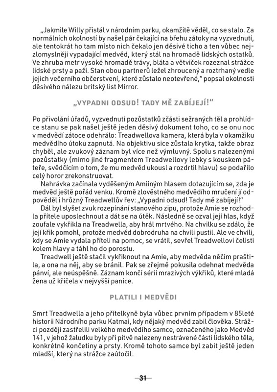 Skutečné případy útoků velkých zvířat na člověka. Žraloků, medvědů, velkých kočkovitých šelem, ale také případy tajemné, dosud nevysvětlené, v nichž mohl hrát hlavní roli predátor, jehož identitu dodnes neznáme. V knize naleznete příběhy, které později inspirovaly filmové tvůrce, či které ve své době rezonovaly v médiích napříč celým světem. Například událost, kterou známe z filmu Čelisti, masakr tří mladých lidí v americkém národním parku, napadení mladé nadějné surfařky a dalších 17 hrůzyplných historek.