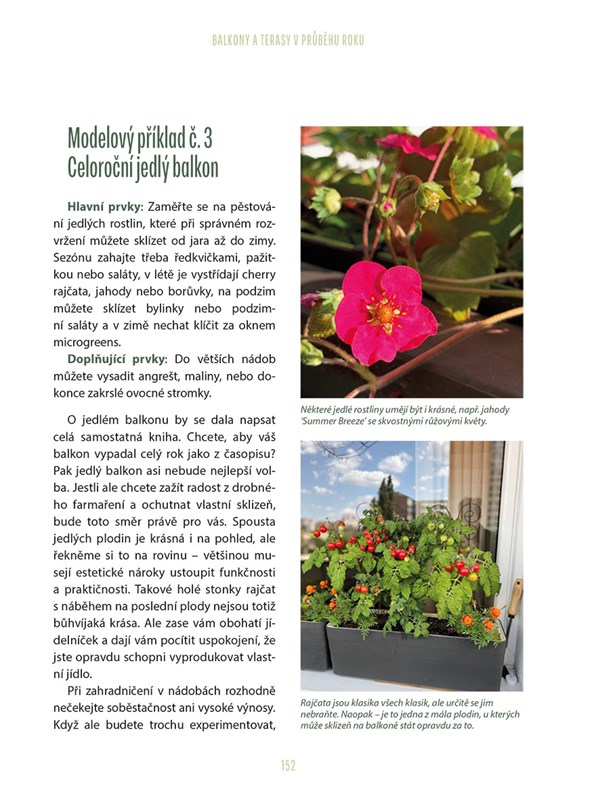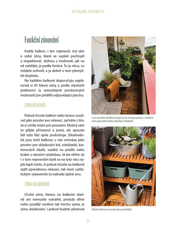 Balkon může být plnohodnotnou součástí bydlení, nejen místem na odkládání věcí. Tato kniha ukazuje, jak z jakéhokoli balkonu vytvořit promyšlený prostor pro odpočinek, tvoření i každodenní malé rituály. „Balkonistka“ Lenka sdílí svou vlastní cestu od chaotického prvního balkonu až po promyšlený městský balkon s konkrétními návody. Ukazuje, jak pracovat s mikroklimatem, rozdělit balkon na zóny, zvolit vhodné nádoby a substráty, sesazovat rostliny, přemýšlet udržitelně a využívat balkon po celý rok. Nechybějí vodní prvky, inspirace reálnými balkony ani praktické tipy, které fungují v běžných podmínkách. Autorka popisuje své vlastní chyby i osvědčená řešení a pomocí infoboxů, moodboardů a DIY postupů, díky nimž zvládnou hezký a funkční balkon i ti, kdo nemají čas ani chuť stát se „opravdovými“ zahradníky.