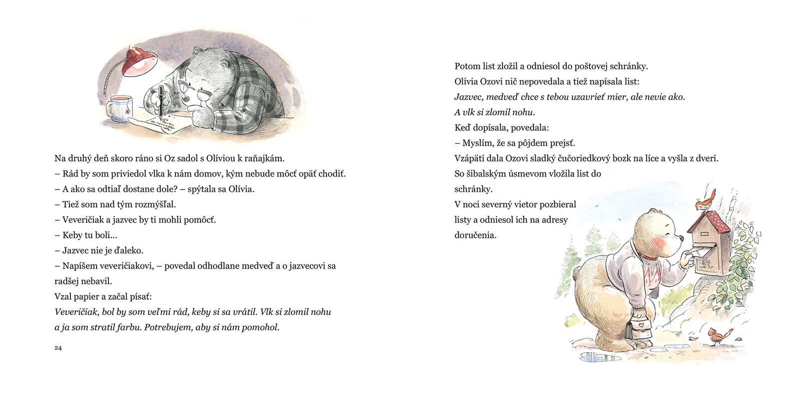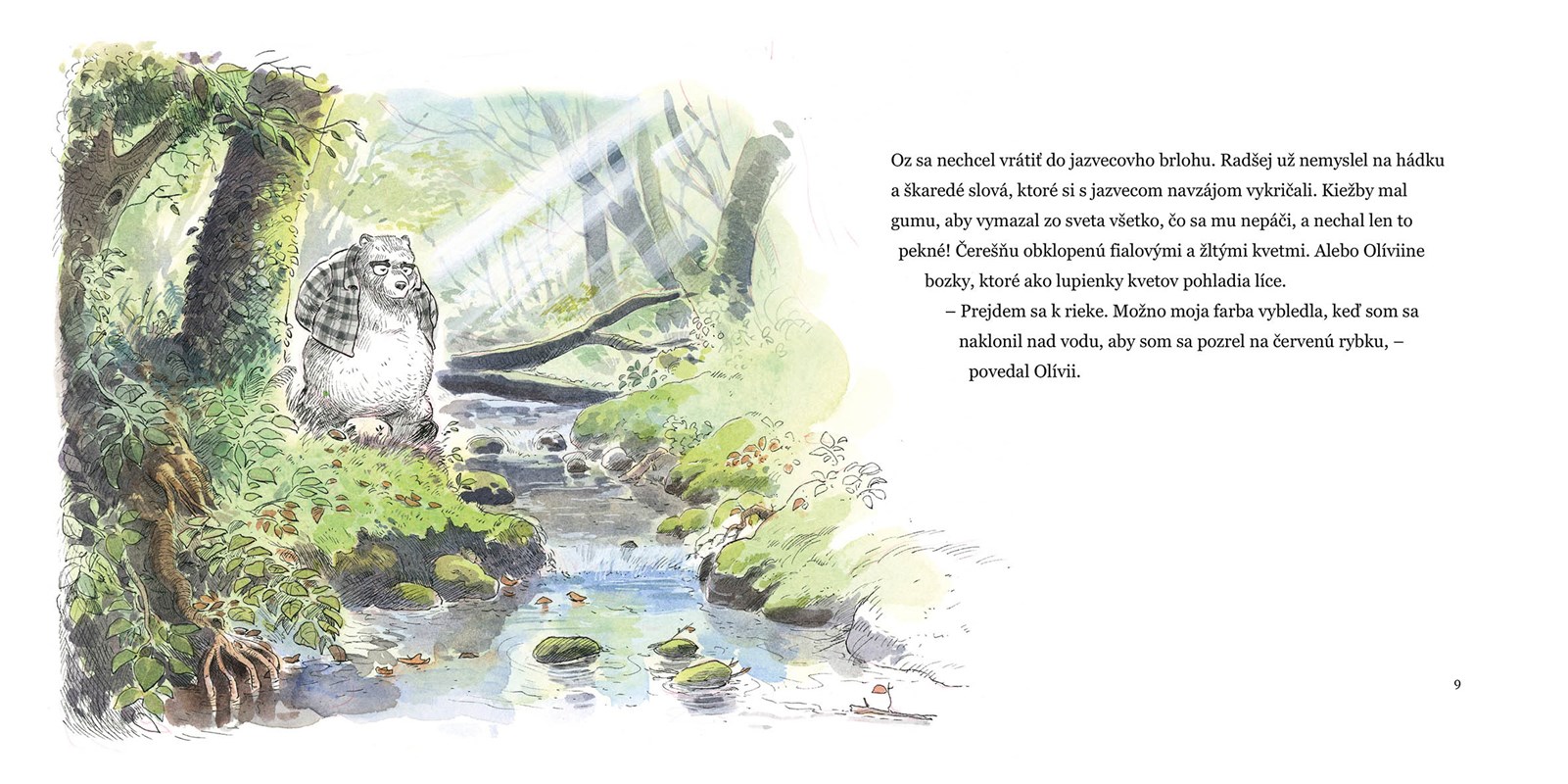 Nešťastník medveď stratil farbu. Netuší však kde. Všetko okolo neho je farebné, iba on je čiernobiely. Vie, že by ju mal ísť hľadať, no samému sa mu do toho nechce. Prehodí si teda cez rameno batoh a vyberie sa za priateľom vlkom, ktorého nevidel už celé dni. Chce ho požiadať o pomoc, no keď príde k jeho nore, všade vládne chaos a neporiadok. Medveď zistí, že vlk si zlomil nohu a ťaží ho veľké tajomstvo.