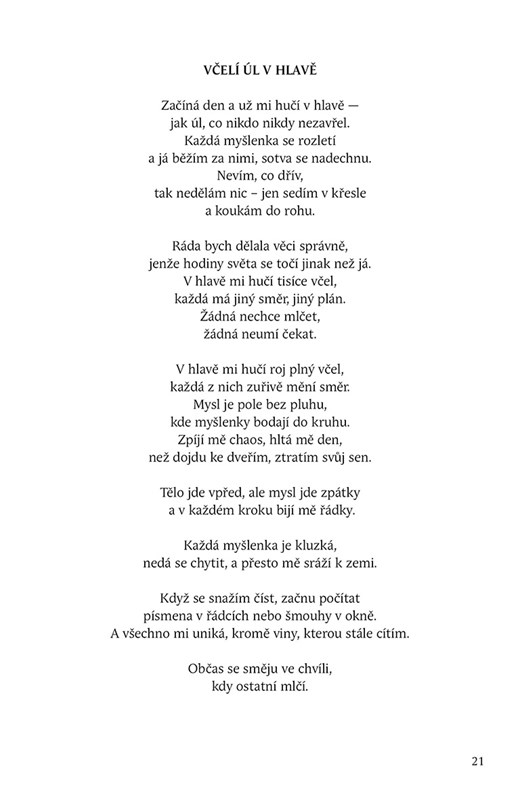 Otisk dívky bloudící mlhou vlastních myšlenek. Verše, útržky a příběhy o bolesti, kráse i o tom, co zůstává, když všechno kolem zmizí. O tom, když se rozpouštíme v melancholii jako déšť v kalužích. Z ticha zrozená podaná ruka. Připomínka, že i když bloudíte, nejste sami.