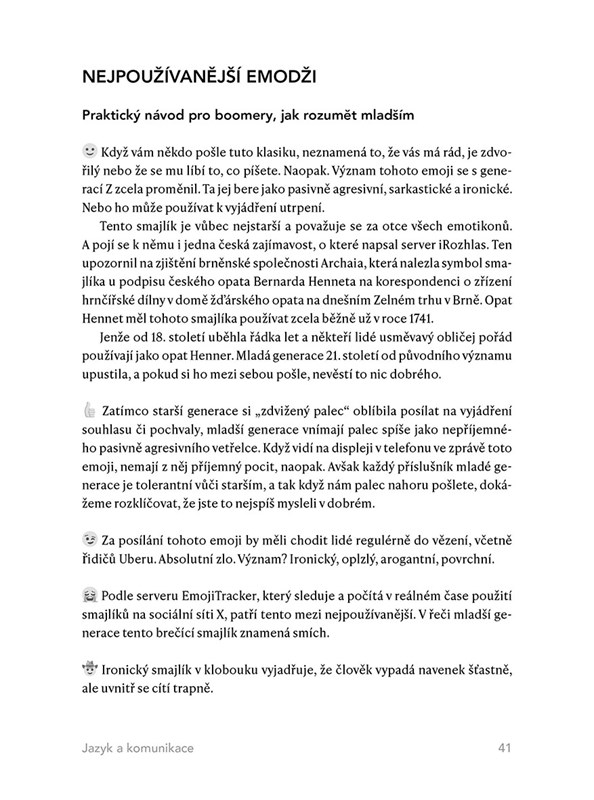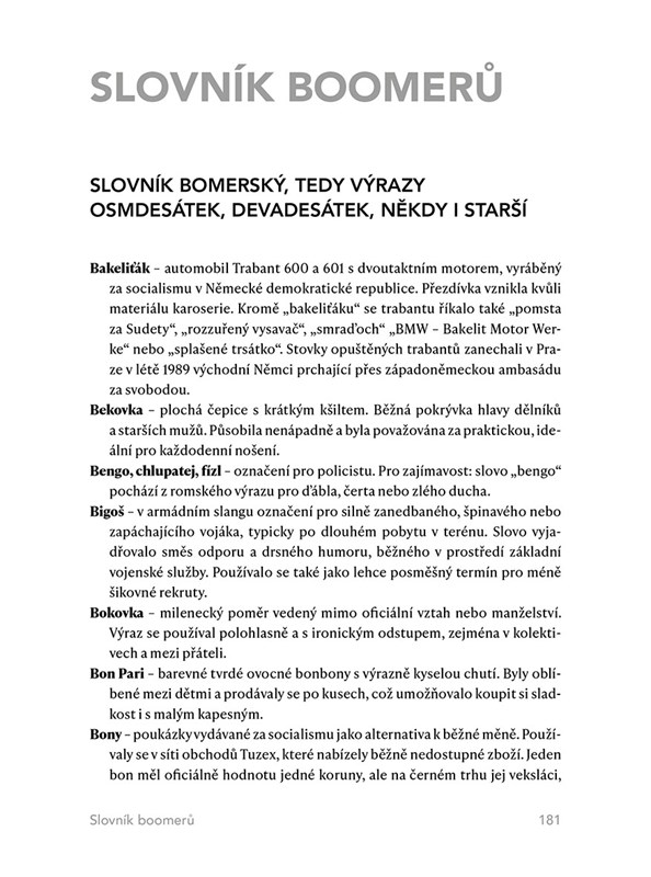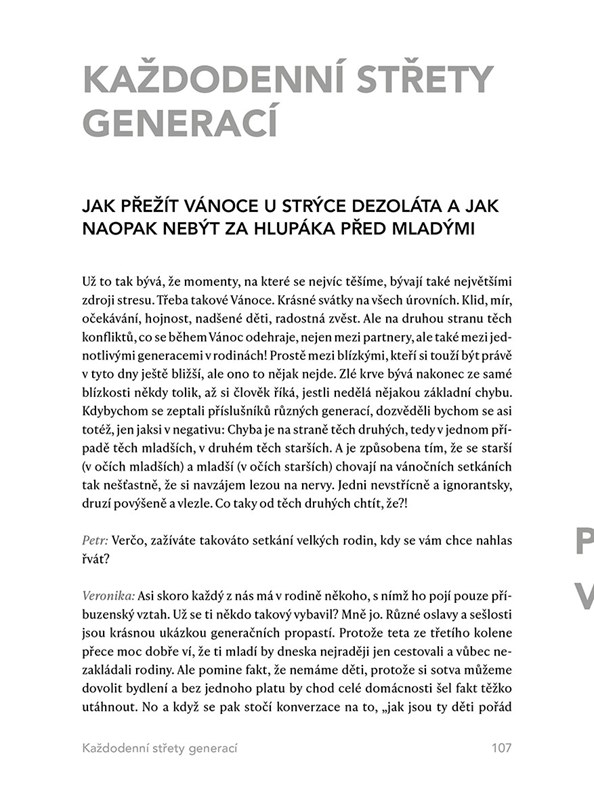 Z jedné strany slyšíme: Mladým se nechce makat a nic nevydrží! Z druhé zase: Boomeři jsou hulváti a vykoupili nám byty! A z obou: Ti druzí na nás kašlou! Generační konflikt tu byl vždy. Ale nyní se kvůli zrychlení demografických, technologických a ekonomických změn stává zásadním problémem Česka. Kniha autorů stejnojmenného podcastu Veroniky Capákové a Petra Honzejka mapuje různé podoby generačního neporozumění od politiky přes práci, bydlení, vztahy, sex, konzumaci alkoholu až po vzájemně nesrozumitelné jazyky. Vše odlehčenou formou dialogu mezi „sněhovou vločkou“ a „boomerem“, doplněnou množstvím expertních pohledů a exaktních údajů. Nechybí generační rozhovor s prezidentem Petrem Pavlem ani výkladové slovníky výrazů, které jsou pro jednu generaci samozřejmé, zatímco pro druhou je jejich smysl naprostou záhadou.