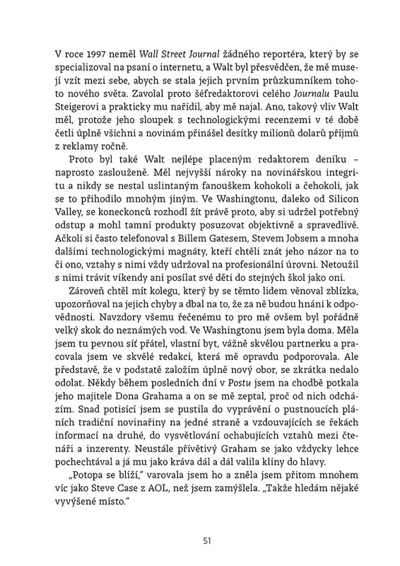 Burn Book je kronikou vzestupů a pádů, bláznivých nápadů, hamižnosti a zhýralých večírků… ale především jedné dlouhé a nekompromisní novinářské kariéry. Navzdory škodám na společenské soudržnosti, které bratři z technologické čtvrti napáchali, zůstává Swisher optimistická ohledně potenciálu technologií problémy nejen vytvářet, ale i řešit. Vyzývá všechny, o kterých píše, aby činili lepší a promyšlenější rozhodnutí, a to i v době, kdy se nová sada mocných nástrojů umělé inteligence chystá znovu změnit svět.
