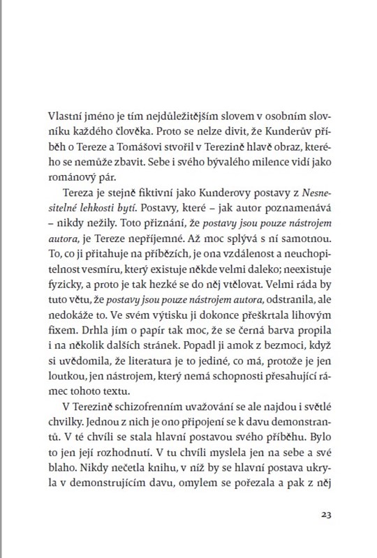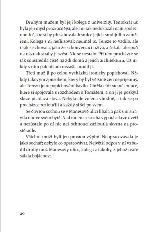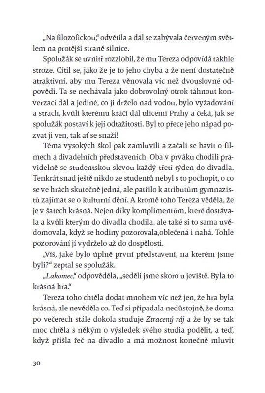 Tereza je mladá žena, studentka literatury a spisovatelka, která kolísá v mezilidských vztazích, partnerství, ohledává intimitu i vlastní sexualitu i tělesnou intimitu. Po nečekaném úspěchu svého debutového románu se vyrovnává se společenským tlakem i tíhou očekávání, která od ní všichni mají.
