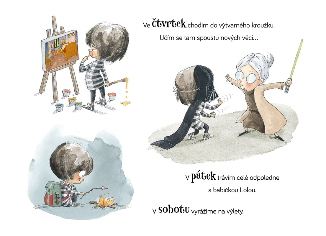 ve čtvrtek maluje, v pátek si hraje s babičkou a v sobotu