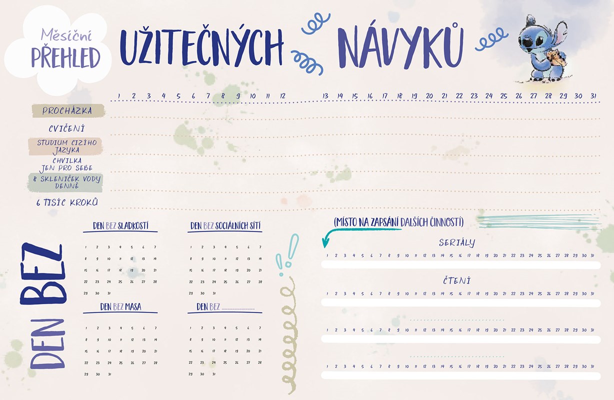 Ponoř se do Stitchova světa, tvoř, plánuj a užívej si každou chvilku s neodolatelným mimozemšťánkem! Stitchovi můžeš prozradit naprosto cokoli! V super roztomilém plyšovém deníku najdeš komiksy, kreativní úkoly, inspirativní citáty, tipy, jak pohodově trávit čas, a hlavně si do něj můžeš zapisovat svoje tajné sny nebo cokoli, co tě zrovna napadne. Se Stitchem je každý den lepší!