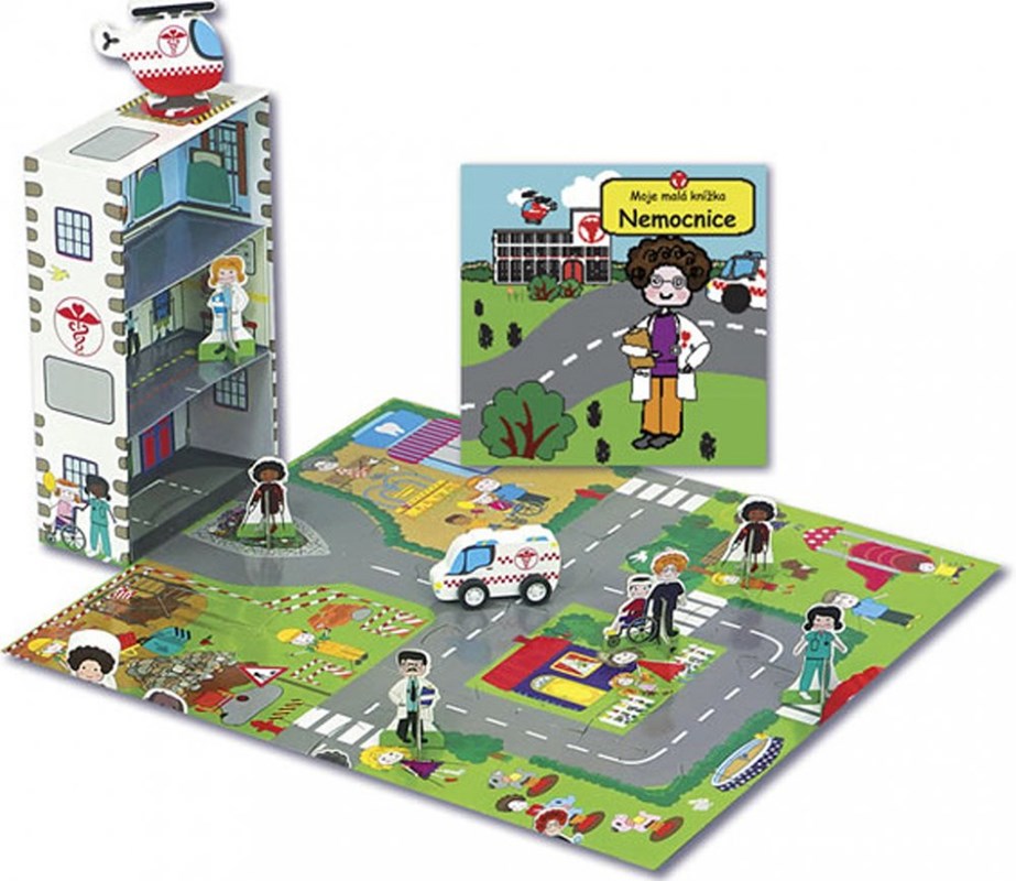 Zábavná souprava pro aktivní hru obsahuje knížku o 64 stranách, věnovaných dění v nemocnici, masivní dřevěné záchranky a kartonové figurky, krabici, kterou využiješ jako budovu nemocnice, puzzle z 16 masivních dílků, z kterých můžeš složit celou nemocnici i s heliportem. Souprava nabízí nekonečné možnosti k učení a hře. Z puzzle, krabice, dřevěných záchranek a figurek můžeš postavit vlastní nemocnici i s lékaři a pacienty. Všechny cesty v jednotlivých skládačkách na sebe navazují, takže nasbíráním více hracích sad můžeš vytvořit celé městečko. Přáli bychom si, aby děti s knížkami ze série Moje malé městečko vyrůstaly. Nejdřív jim z nich mohou dospělí číst nahlas a text i fotografie vysvětlovat. Později pak malí čtenáři budou už sami obracet stránky knížek a chápat smysl napsaného. Všechny soupravy pro aktivní hru podporují a povzbuzují dětskou představivost a rozvoj učení tím, že od raného věku vybízejí děti ke hře spojené s vyhledáváním faktů.