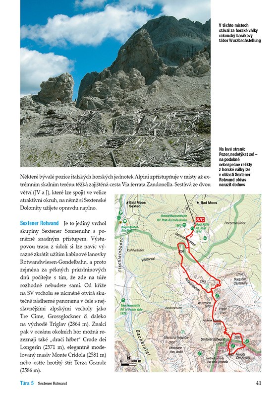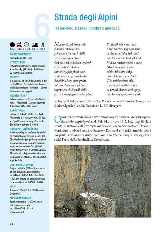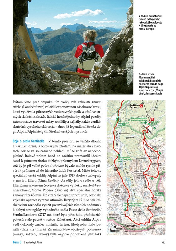 30 neobyčejných túr. Historická fakta a zajímavosti. GPS tracky ke stažení. Dolomity se v letech 1915-1917 staly dějištěm tragických válečných událostí. Touto jedinečnou přírodní kulisou probíhala jihotyrolská fronta 1. světové války, na níž padly statisíce vojáků rakouské a italské armády. Dodnes tu v terénu narážíme na četné stopy bojů, staré vojenské stezky a bývalé válečné pozice. Autor knihy představuje celkem 30 mimořádně atraktivních túr, které vedou těmi nejzajímavějšími frontovými lokalitami – od Sextenských Dolomit přes Marmoladu až po náhorní plošinu Lavarone a masiv Pasubio. Podrobné popisy tras doplněné mapkami a množstvím fotografií. Zasvěcený pohled na historické a geopolitické souvislosti. raktické rady a informace včetně tipů na vybavení a zajištění bezpečnosti. GPS data ke stažení.