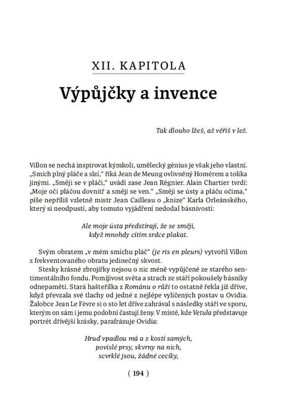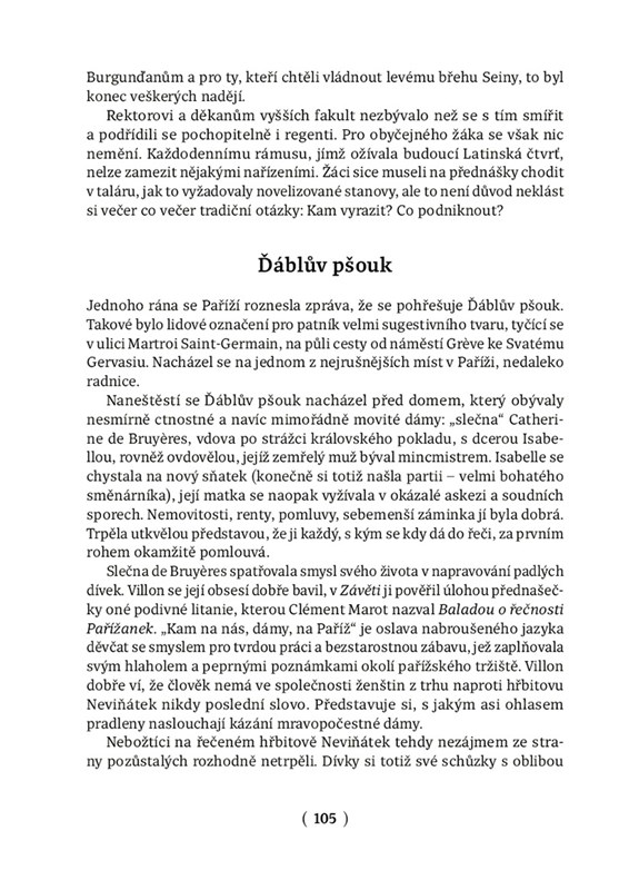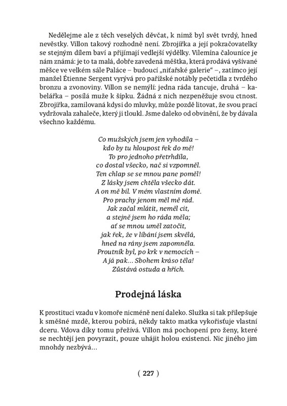 Francouzský historik a spisovatel Jean Favier popisuje na základě dostupných dokumentů pohnutý život básníka Françoise Villona – bohéma, zlodějíčka, přítele spodiny i dvořanů v Blois – a současně s ním i všední a sváteční život představitelů jednotlivých vrstev pařížské společnosti jeho doby. Autorovi se podařilo v dobových dokumentech dohledat skutečné osoby a propojit je s odkazy a narážkami ve Villonových básních – například sklepmistra, který pančoval víno. Text je proložen citáty z dobové poezie a zejména z díla samotného Villona – od raných epigramů až po závěrečná díla Odkaz a Závěť.