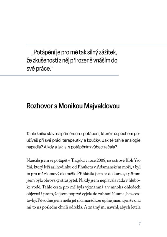 Unikátní pohled na osobní rozvoj inspirovaný světem potápění přináší kniha Moniky Majvaldové a Simony Martínkové Rackové. Čtivě a srozumitelně propojuje dlouholeté potápěčské zkušenosti s koučovací a terapeutickou praxí a ukazuje, jak lze principy fungující pod hladinou využít v každodenním životě – v partnerských vztazích, rodině i práci. Prostřednictvím příběhů, autentických příkladů z praxe a závěrečných reflexivních otázek zve kniha čtenáře k objevování vlastního vnitřního světa. Potápěčské zkušenosti nejsou potřeba, otevřenost ke změně ano.