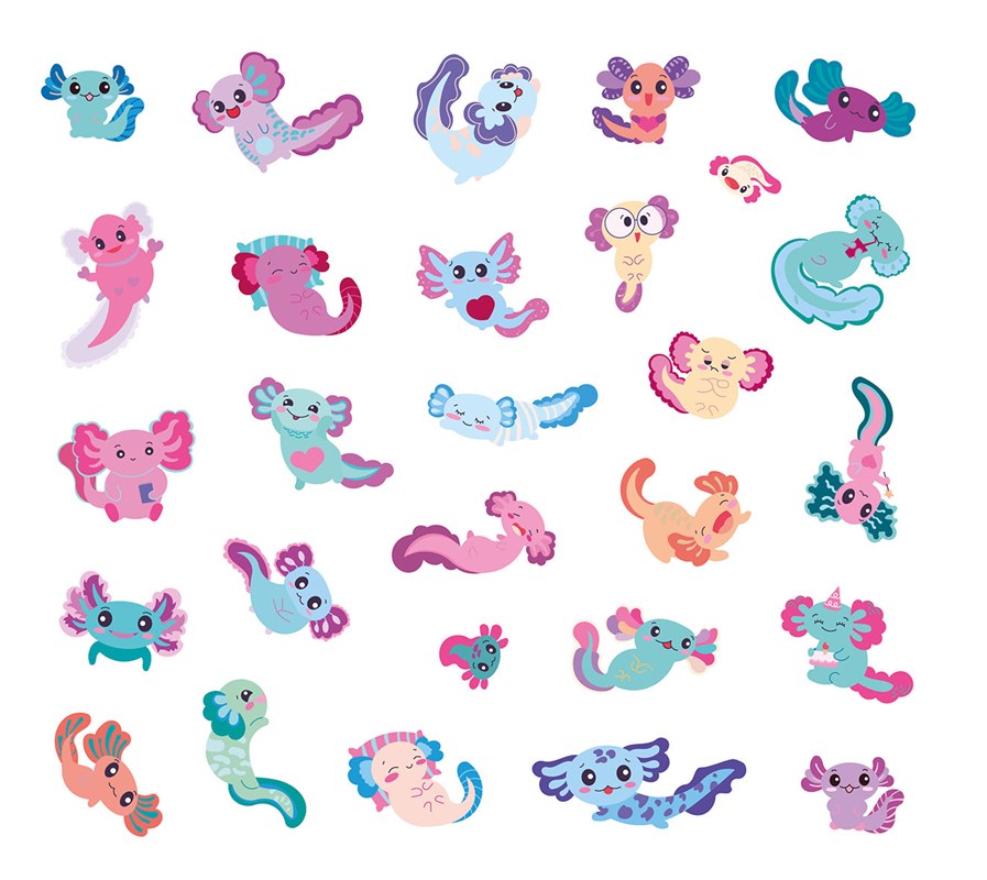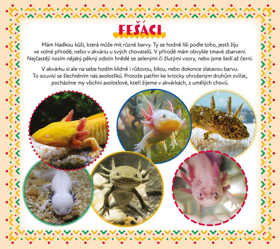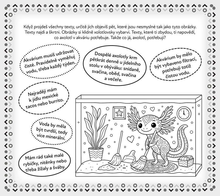 A připrav si pastelky! Najdeš tu spoustu barevných obrázků k vybarvení – a k tomu víc než padesát samolepek s námi, axolotly. Nalep si nás, kam jen chceš. Otevři knihu a pojď se mnou prozkoumat svět, jaký ještě neznáš.
