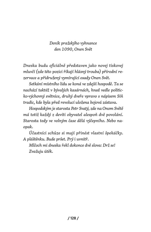 Brnem to neskončilo, Josefa Ječmínka čeká další dobrodružství, které dosáhne mezinárodního rozměru. Pražský policista si po nedobrovolném přesunu do Brna myslel, že už ho nic nemůže překvapit. Když po něm však pátrá FBI, CIA i Chuck Norris, je z bezpečnostních důvodů odklizen na Šumavu, kde v utajení zastává funkci mluvčího chráněné krajinné oblasti Onen Svět. Parta místních podivínů zahrnující starostu se sebevražednými sklony, bývalého strážce hranic, šumavského kovboje i vietnamského provozovatele autoservisu mu to ale moc neusnadňuje. Tím spíš, když v osadě dojde k vraždě seniora z Prahy a Josef se stane hlavním podezřelým a hvězdou televizní reality show Česko hledá vraha, kterou doprovází legendární reportérka Dorota Křivákova. Z Onoho světa se stane vyhledávaná true crime lokalita a Josefovi jde navíc po krku Američan pátrající po dávném šumavském tajemství, které může zásadním způsobem ovlivnit pohled na moderní dějiny lidstva.