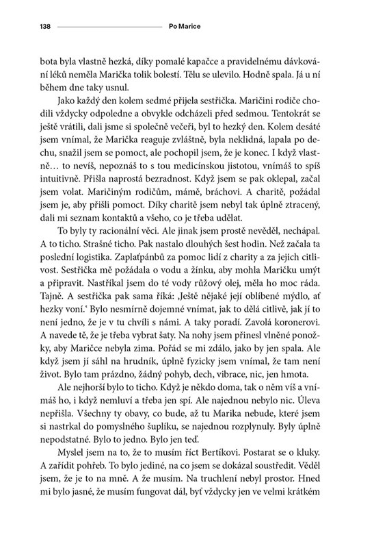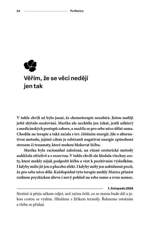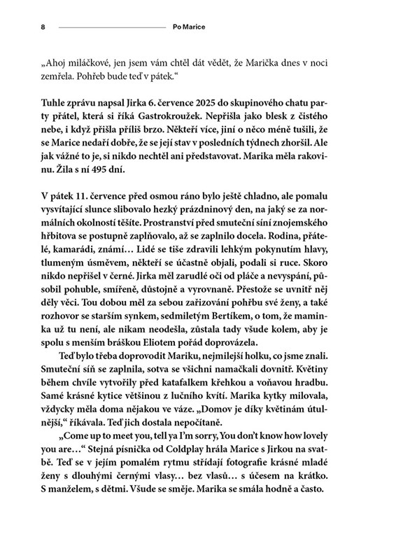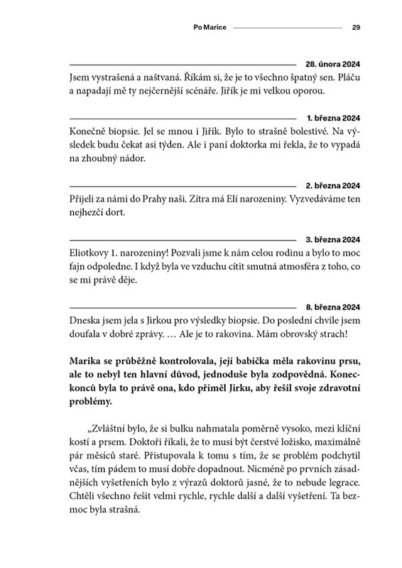 Marika, Jirka a jejich dva kluci byli krásná rodina. Pak si Marika nahmatala bulku v prsu. Jirkovo vyprávění a Maričiny autentické deníkové zápisky skládají příběh, který může potkat každého z nás. Jaké to je vyslechnout si fatální diagnózu? Jak s ní bojovat, když léčba nezabírá? Odkud brát sílu, když se cítíte bezmocně? Jak pomáhat, když není jak pomoct? Jak říct synům, že máma už tu není? Navzdory všemu smutku je tu stále naděje: „Protože ráno zase vstanu a udělám palačinky.“
