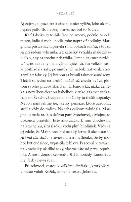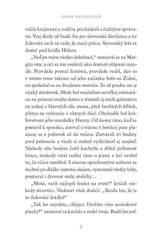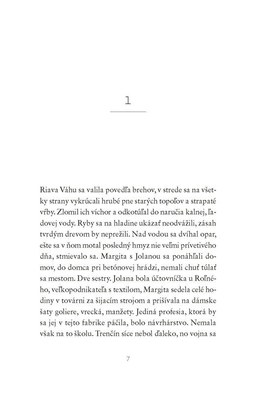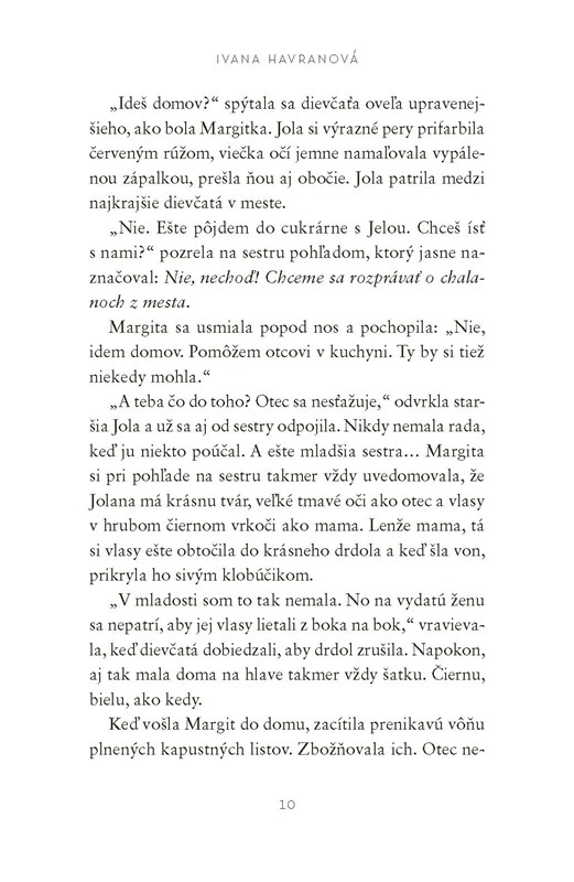Román realisticky vykresľuje život v malom slovenskom mestečku v čase Slovenského štátu, postoj obyvateľov k Židom pred tým, ako ich odvliekli do koncentračných táborov. Rodina dvoch dievčat – Joly a Margit je dosť bohatá, otec vlastní krčmu s reštauráciou, matka malý obchod – galantériu. Staršia zo sestier už pracuje ako účtovníčka v miestnej továrni a mladšia chodí do