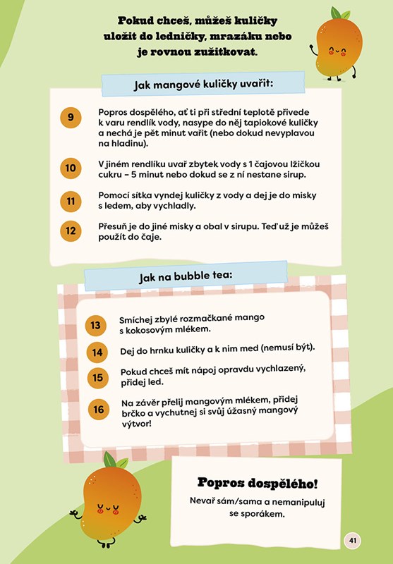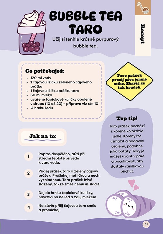Objev svět bubble tea! Tahle knížka je nabitá zajímavostmi, tipy a recepty, díky kterým si bubble tea zvládneš připravit i doma. Naučíš se vyrobit vlastní tapiokové (boba) kuličky, vyzkoušíš spoustu příchutí a zjistíš, jaké nejbláznivější a neobvyklé kombinace frčí ve světě. Nechybí ani krátký příběh o tom, kde se bubble tea vzalo, zábavné aktivity a pár základních pojmů k bubble tea, ať jsi vždy hned v obraze. Tak už nečekej a vydej se s námi na hravou cestu plnou barev a chutí a zažij něco nového!