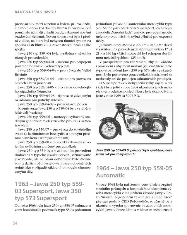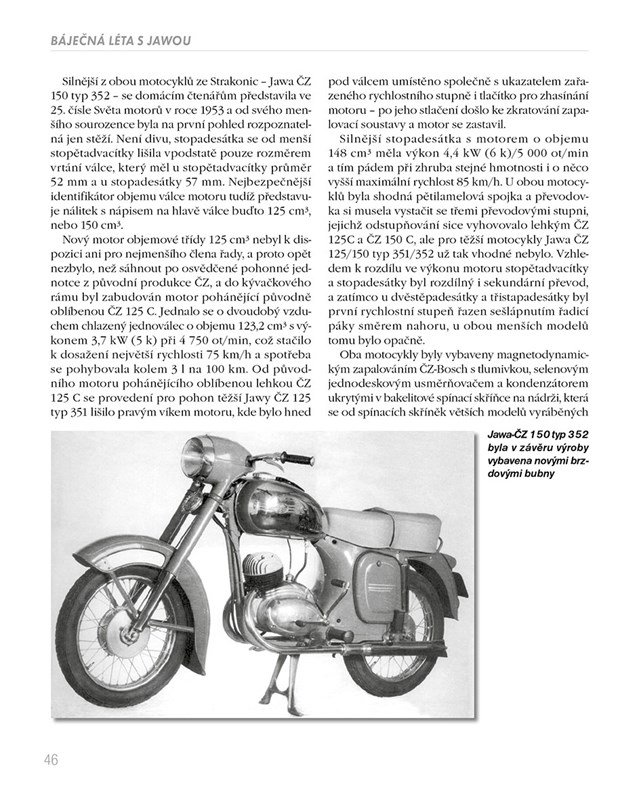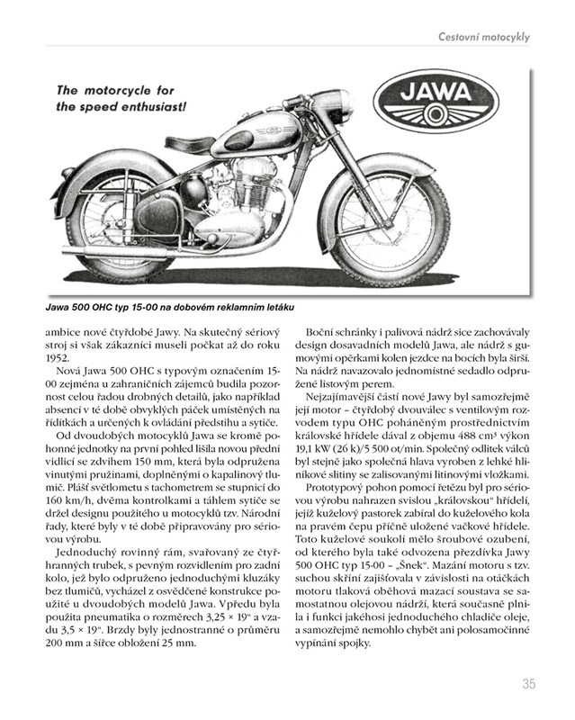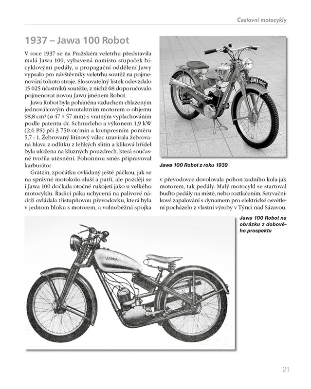 Kniha, která potěší všechny příznivce jedné stopy a zvláště pak fandy legendární značky Jawa. Chronologicky seřazená historie a popis jednotlivých modelů napříč celým výrobním spektrem až do současnosti – od cestovních motocyklů přes prototypy, malé motocykly, závodní a soutěžní stroje až po automobily – vás podrobně a čtivou formou seznámí se značkou, které vdechl život její zakladatel František Janeček už v roce 1929.