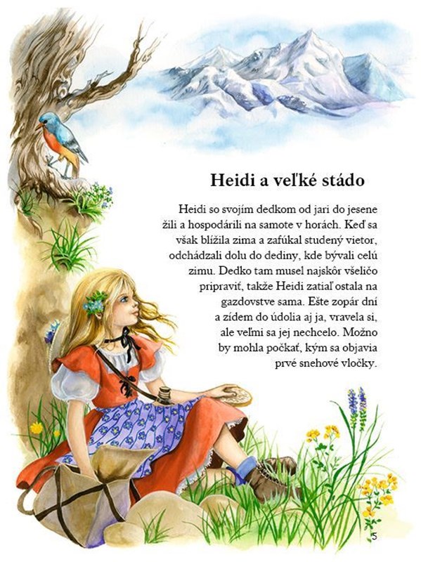 Možno ste si už obľúbili príbehy Heidi, dievčatka z hôr. Táto knižka a jej pekné ilustrácie vám umožnia prežiť s ňou aj ďalšie dobrodružstvá: ako previedla cez rozvodnený potok stádo oviec, ako sa stretla s vlkom, čo urobila, aby zachránila psíka a ako sa postarala o šteniatka, no aj o jej vystúpení v cirkuse a o tom, aké krásne Vianoce zažila s dedkom v dedinke vysoko v horách.