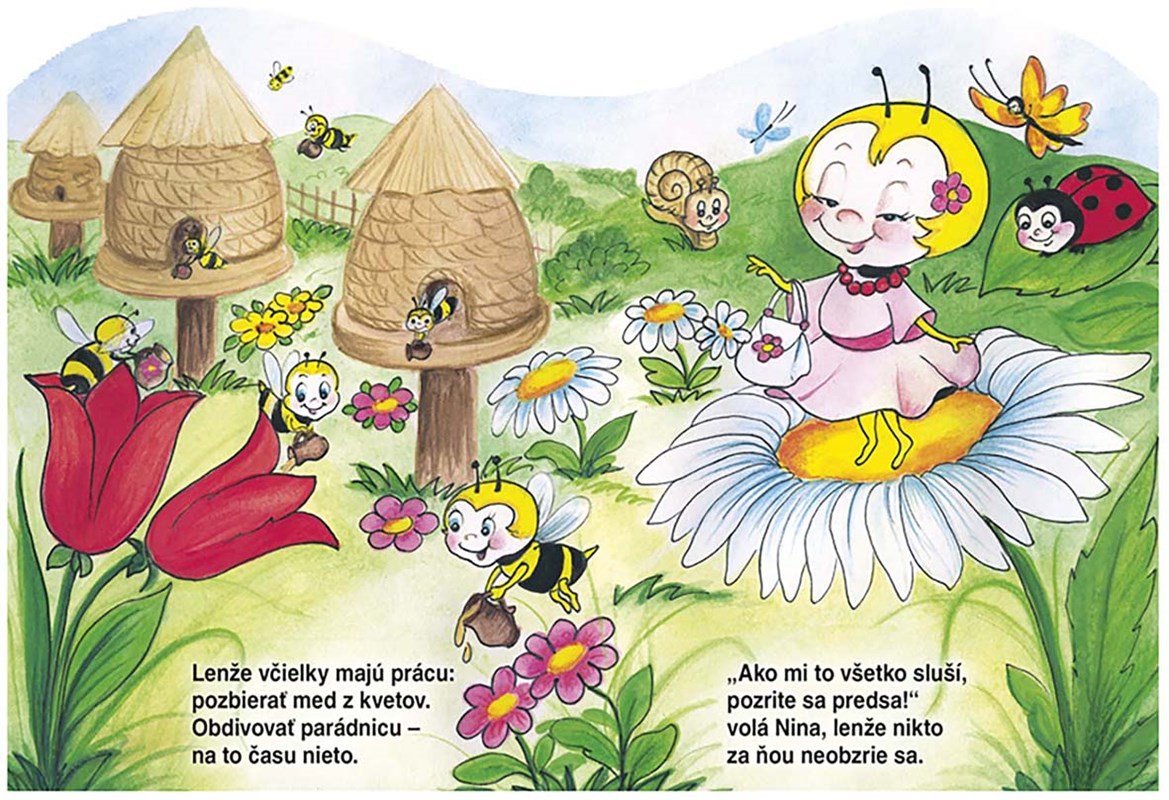 Rozkladacie výsekové leporelo rozpráva najmenším deťom o usilovných včielkach a jednej, ktorá zo začiatku usilovná nebola. Ako to dopadne s včielkou Ninou, ktorá sa namiesto zbierania nektáru rada parádi? Pôvabné leporelo s veršovaným príbehom je ideálne ku spoločnému čítaniu a objavovaniu.