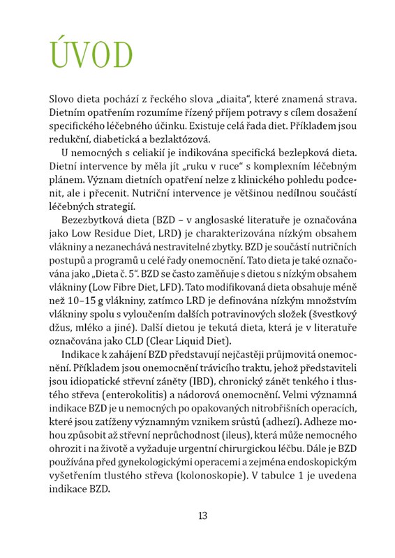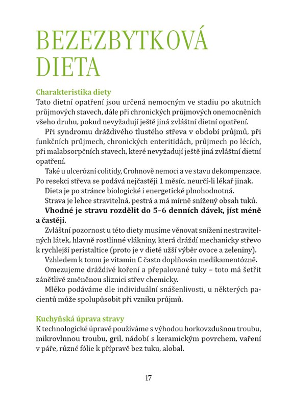 Dietní opatření v této knize jsou určená nemocným po akutních průjmových stavech a při chronických průjmových onemocněních všeho druhu, pokud nevyžadují ještě jiná zvláštní dietní opatření, dále při syndromu dráždivého tlustého střeva a také u ulcerosní kolitidy a Crohnovy nemoci. Dieta je vhodná i po resekci střev a z počátku zavedení vývodu z tenkého i tlustého střeva. Obsahem živin se dieta řadí mezi plnohodnotné. Strava je pestrá, lehce stravitelná a nenadýmavá. Dietu lze upravovat podle aktuálního zdravotního stavu pacienta a jeho stravovacích možností. Pacienti zde najdou jak vhodné potraviny a vhodnou kuchyňskou úpravu pokrmů, tak i rady, čemu se mají při nutnosti dodržování této diety vyhnout.