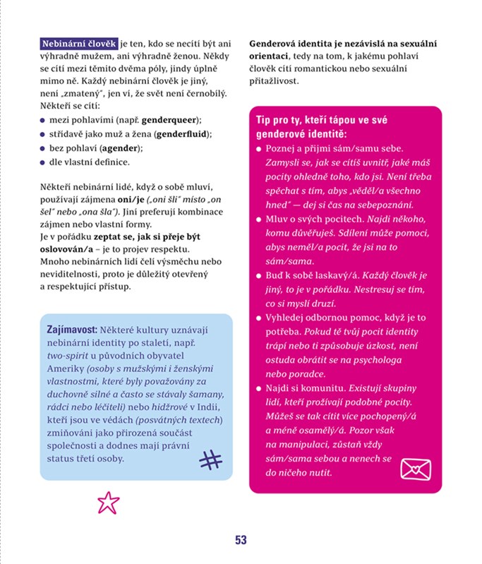Kniha přední české sexuoložky Laury Janáčkové se zabývá srozumitelnou edukací důležitých témat, která teenageři řeší. Čtivou formou poskytuje zajímavé informace týkající se nejen základních znalostí těla a jeho fungování, ale řeší i otázky sebevědomí, seznamování a otázky rozdílnosti přátelství, kamarádství a lásky. Zároveň popisuje nejčastější problémy v intimním životě a péči o vztahy.